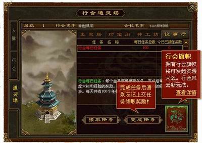 发布行会任务之场所。所有行会成员皆可在此免费接取任务,任务完成之后便能获得搭建通灵塔必备的材料。