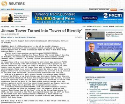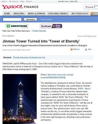 09年4月8日,包括**、福布斯、雅虎、时代华纳、商业周刊在内的40余家欧美权威媒体对上演在上海的历史上最大游戏广告——“中华第一楼上海金茂大厦变身永恒之塔”这一事件进行了深入的报道及评论。在报道中,欧美各大主流媒体详细地介绍了上海金茂大厦和永恒之塔在各自领域内突出的行业地位。此外,除了赞赏网络游戏《永恒之塔》惊人的视觉效果,**还感叹此次活动是“世界上迄今为止最大的游戏广告”,两者的结合产生了轰动的社会效应。