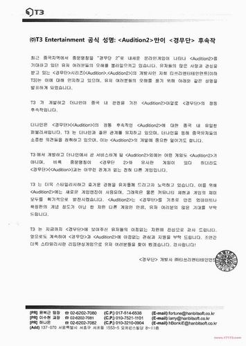 4月10日上午消息 韩国T3 Entertainment今日向17173发来一份传真,针对日前“中国内地出现的一款中文名类似‘劲舞团2’的网络游戏”发出声明:由T3开发,并由上海九城代理的《Audition2》才是《劲舞团》的正宗续作。