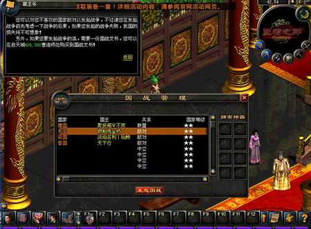 向敌国发起国战,一旦取胜,就能获得对方国库中的所有金钱,那可是天文数字的一大笔财富,有了它,保证你国库储备大增,国运更加昌盛。而且,这样还能顺便狠狠打击敌国的元气噢。