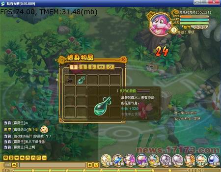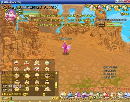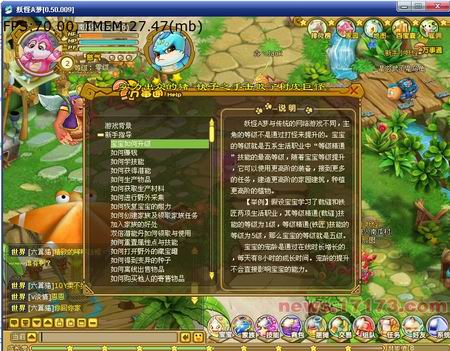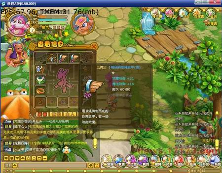 笔者很快就进入到了游戏,非常流畅!初进游戏的场景是在你创建角色时选的家园场景。笔者选的是沙漠。画面很好看,很吸引人。点出地图看了下,进入到了其中一个主场景——南瓜村。画面依然是很精致,很漂亮,这在2D游戏中很少见。笔者先四处逛了下,在线的玩家比较多,可见此款游戏的人气还是不错的。因为这是一款PRG游戏,不是通过打怪来升级的。笔者也是个新手菜鸟,一时不知道该怎么升级,系统此时也没有提示。新手教学这点做得不是很好,建议改进一下。游戏的自动寻路做到很到,TAB键点出当前地图,鼠标指到那个位置,即会显示位置的坐标,单击一下,就可以自动走到该坐标了。而且当前地图上面有当前场景所有NPC的名字,选中NPC的名字,然后确定,就会自动将你带到所选的NPC前面了。游戏的等级是由宝宝的当前的生活技能的最高阶数来决定,你要提升自己的等级就得提升自己的生活技能。