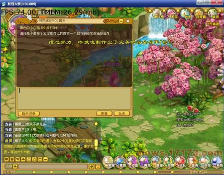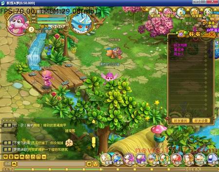 《妖怪A梦》的操作笔者认为比较简单,即使是新手也可以迅速地进入状态。鼠标左键行走,可以自动寻路(上面已有介绍了)。界面的右下方,分别是:宝宝,家族,技能,背包,摆摊,交易,组队,任务,好友,系统等选项。点击进去即可查看。界面的右上方是:排行榜,家园,地图,百宝箱,雇佣,万事通等选项!界面的左上方,是你个人的状态显示,等级,HP值,怒气等!界面的中间是聊天系统,值得一提的是,游戏的表情都十分可爱,十分形象!还有,游戏点“组队”可以查看到当前场景的所有队伍,并可以选择申请加入,这个设计在各种游戏里也是很少见的。《妖怪A梦》里面有在线GM,你有什么不明白的地方可以即时向GM咨询,这点设计笔者认为比较好!而且在游戏里,玩家之间还可以通过视频进行交流,这点是首创哦。笔者在玩的过程中遇到了游戏临时维护,系统不但出有公告,而且还有维护倒计时:还剩多少秒就维护,不断的提示。这点很贴心!
