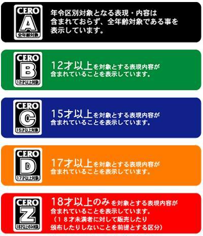 CERO 新制将分级扩充为 5 种,并改以 A / B / C / D / Z 的英文字母来区分不同的级别,同时以鲜明的黑 / 绿 / 蓝 / 橘 / 红的 5 种底色标示在游戏封面左下角与侧边下缘: