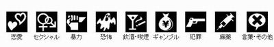 参考 ERSB 所制定的 CERO 同样也采用了“内容描述”来针对游戏所包含的特定内容做进一步说明,总共分为 9 个项目,包括:恋爱、性、暴力、恐怖、饮酒 / 抽烟、赌博、犯罪、毒品、言语与其它。这些项目将会以图标方式标示于游戏包装的背面。
