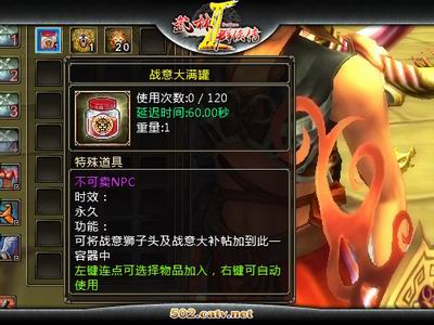 “战意大满罐”的使用方法非常的简单,只要双击该道具,等鼠标变成“右手”形状的图标后,再点击“战意狮子头”或“战意大补帖”等战意道具,即可轻松完成添加动作,既轻松又方便。“战意大满罐”的最大容量为120,也就是说,一个“战意大满罐”一次可以储存高达120个“战意狮子头”或4个“战意大补帖”,相当于120颗战意存量,让战意技能更持久,属性提升更有保障,实在是外出打怪、团战单P的必备道具!但需要注意的是,被添加的战意道具战意豆数目不能超过“战意大满罐”剩余战意空间,否则无法成功添加。当战意道具全部添加完成后,右键点击“战意大满罐”即可开启自动使用功能,这时,只要角色每使用一次战意技能,“战意大满罐”即可为角色自动补充一颗战意存量,直至其储存的战意存量全部使用完毕,让战意持续拥有,毫无后顾之忧。