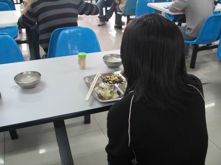 小A的午饭是一勺红烧茄子,一勺冬瓜花蛤,一勺木耳炒蛋,主食是半份米饭。记者问她够吃么,她说,天气热了,自然就吃得清淡些。而且,“今天吃饭早些,不太饿。”