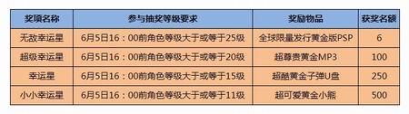 1:活动结束后,奖项将由高到低进行抽取。首先抽取最高奖项,无敌幸运星(黄金PSP),所有25级和25级以上玩家均有机会,然后所有达到此要求但并未得奖者,进入下一奖项等级范围的抽奖,依次类推。