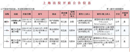 根据上海法院的开庭公开信息显示,上述案件将于2009年7月8日下午14时在上海市第一中级**公开审理。据悉,这是魔兽易主风波发生以来,九城在不到一个月之间里对暴雪提出的第三起诉讼。