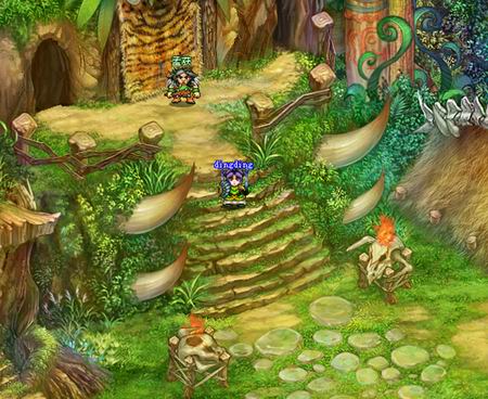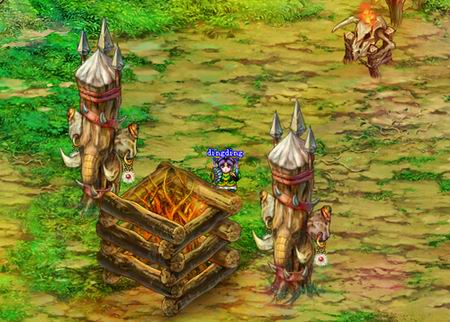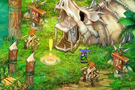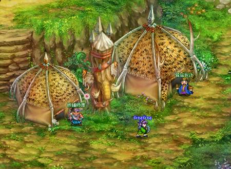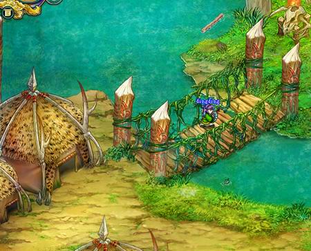 三江城位于小河边,那名字当然就是因此而来咯。不算大的城池被小河生生隔断,由一架藤条木板桥连接起来,走上去晃晃悠悠,感觉或许某个不经意的瞬间就会断掉。小桥正对着一具巨大兽骨做成的建筑,门口还一个神秘的小圈,如果一不小心跌进去,后果不堪设想。