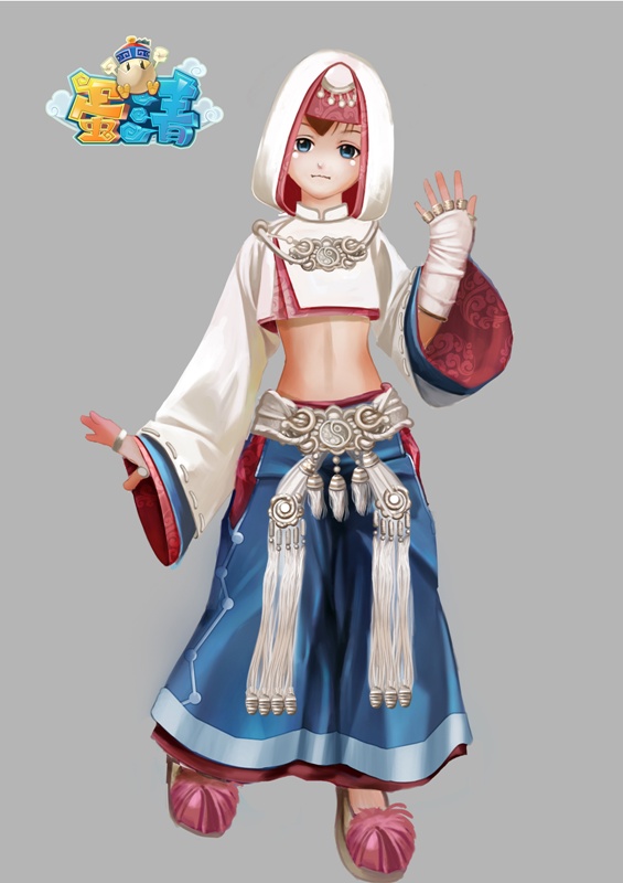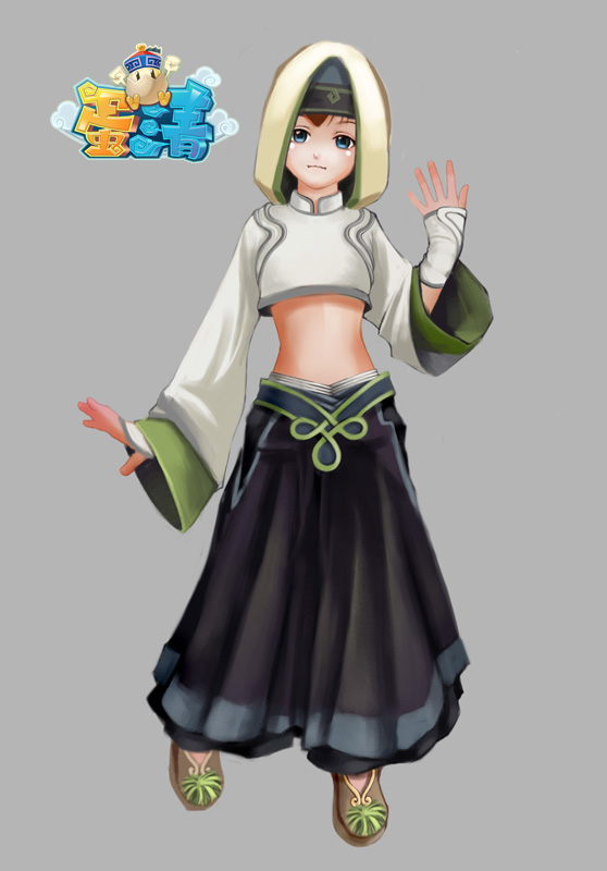 10级女阴阳师以一套长袖短襟上装、喇叭口宽大长裙加盖头兜帽的装扮为整个职业人物系列定下了基调。犹抱琵琶半遮面的兜帽显现了阴阳师职业神秘的一面,而袒露小腹的短襟上衣则将女阴阳师的性感展现无遗。