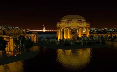 这块地方街道方正,包含了著名的艺术宫。关于艺术宫的事情,可以点击这里看看:美国旧金山艺术宫。同时远眺亦可看见远处的金门大桥 —— 可以说是一处非常不错的风景胜地。不过赛道选在夜间,很多景物的细节便无法看到了。熟悉旧金山地形的朋友估计会知道旧金山有名的是阶梯状的斜坡街道,但是《极限飚车》怕复杂的环境会导致出现不可预知的问题,所以把赛道弄到了比较平坦的地方……这一点有点让人失望。