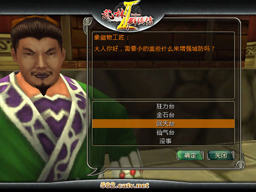城主只需与NPC象征物工匠对话,花费一定费用即可委托其建造“狂力台”、“金石台”、“回天台”和“仙气台”四个象征物的任意一种。其中,狂力台可使大督军和城防官的攻击伤害提升,位于大都城南;金石台可使大督军和城防官的防御力提升,位于大都城西;回天台可使大督军和城防官的气血回复量上升,位于大都城北;仙气台可使大督军和城防官的化劲及回避率上升,位于大都城东。只要守城方的财力够雄厚,在攻城战期间同时建造这四座象征物,可让大督军和城防官的攻防能力获得全面提升!并且城主还可花费银两在“训练官”(952,12264)处训练大督军,让大督军最大气血量增加数倍。不仅如此,守城方还能利用大都水池附近的四座箭塔,射杀攻城的敌人。