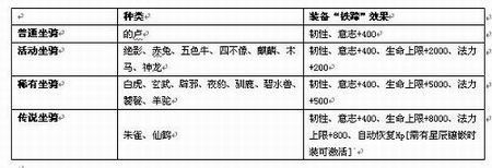 当为心爱的坐骑装备“铁蹄”后,坐骑可为主人增加特殊的属性。目前《天子》中坐骑公分为以下几类: