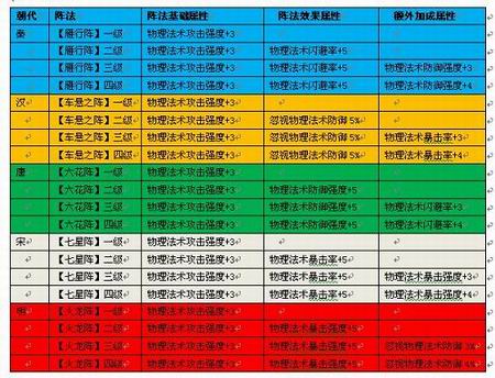 阵法,这个军团作战时被视为战役胜败的关键。每朝每代经过无数战斗的磨练,各自有自己拿手的兵法。如秦代的雁行阵,汉朝的车悬之阵,唐代的六花阵,宋军的七星阵,明朝的火龙阵等。天子中也讲究布阵克敌,每种朝代按相应的阵法组合不同,所得到的属性加成也不同。