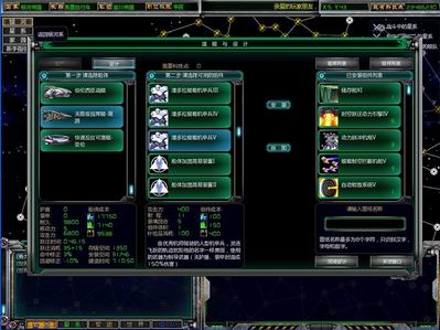 在战舰设计的界面中,我们可以看到有不同的船体和组件选择,初始的船体模型数量较少,各方面的性能也较为一般,随着个人技能的不断提升将会激活更多的船体样式,高级船体相对的性能上就会优越很多。在选择完船体后就是决定要在船上安装哪些组件,组件包括有发射器、储存仓、殖民仓等。你可以随心所欲的设计自己的战舰,充满攻击性武器的侵略型舰队,甚至是仅仅能到达其他星系的观光舰队,又有什么不可以?没有定律,个性才是王道!