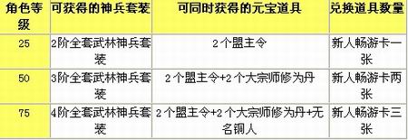 1、赠送武林神兵套装全部直接强化到9;2、赠送的武林神兵套装全部为绑定装备不可交易、不可出售; 3、赠送的武林神兵套装全部为无洞装备;4、“新人畅游卡”同时在百宝阁中出售,每张卡售价500元宝;5、该活动只能参与一次,不可重复参与。