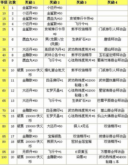 2、5-100级可免费领取赠送道具。105-200级领取的物品可以使用“VIP侠义卡”激活 ,“VIP侠义卡”在百宝阁中出售,每张卡售价1200元宝。