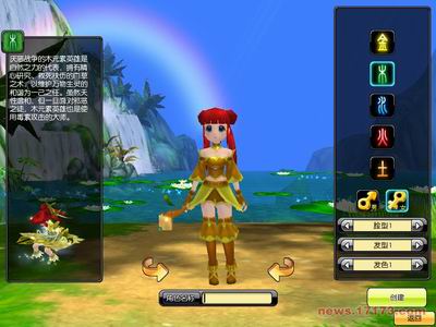 进入游戏,在建立人物时需要在五种职业中进行选择,分别有“金、木、水、火、土”五种元素,五种元素的介绍和选择决定了人物将来发展的方向。