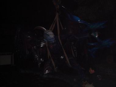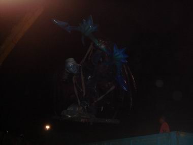 7月23日凌晨整,由盛大网络独家打造的全球第一座游戏人物雕塑——永恒之塔魔族弓星——正式来了09年CJ现场。在出动了大载重卡车及吊车的情况下,这一按照真实比例打造的巨型雕塑,顺利地来到了会场。