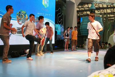 巨人体育帝国CJ展台MM脱鞋颠球 不惧走光