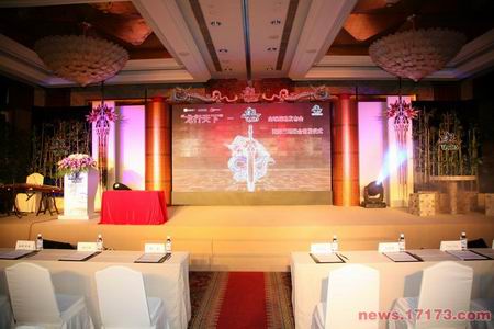 在体验区,有一整排电脑,给对《龙》还不甚了解的到会人员试玩这款游戏,工作人员在一旁耐心的回答每个试玩人员的问题。会场的布置,融合了古典的优雅与现代的时尚:古色古香的画卷配合LED大屏幕,两端的竹林处,左方是古朴的石桌,右方是弹奏着古筝的古典美女。