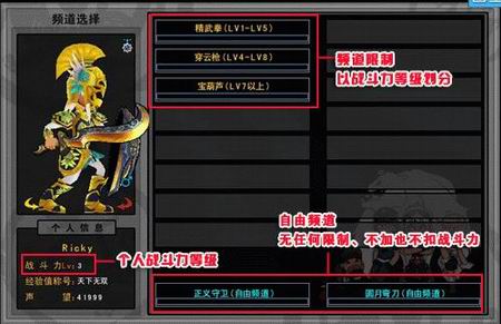全新的个人实力判定系统,根据玩家的战斗力来划分实力等级,以此为根据设定限制战斗力等级的特定频道,让每个等级的玩家更容易的找到与之实力相当的对手,同时也开放未限制战斗力等级的自由频道。