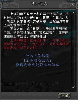 门派副本只有门派的掌门和长老才能开启,副本开启后,门人方可进入。首先用指南符传送到门派广场,点击广场中央的风来道人,即可进入门派副本——上清幻境。