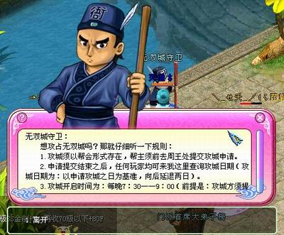 玩家询问NPC攻城规则介绍争夺无双城,首先由争夺方的帮派帮主来向周王申请攻城。周王接受申请后,会有系统告诉你在两天后进行夺城战,时间为决战当天的19:00-21:00。在这段期间内,攻城区域内所有成员全部默认为帮派保护模式,玩家们可以尽情地发挥自己的长处,为帮派荣誉而战,为夺取无双城而厮杀拼搏。