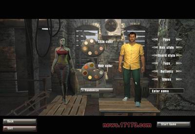 简洁的登陆界面,正中的大屏幕会不断切换游戏中的场景 游戏角色的建立,包括脸型、发型、胡子(女性为嘴唇)、上衣、裤子和鞋子六个部分可以调节,肤色和发色也有多种选择。对比现在MMORPG如《永恒之塔》的角色创建选项,这部分的确不是很出彩。但考虑到游戏的类型,也可以理解了。进入游戏
