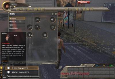 玩家会被随机分配到Sunrise城的不同区域,以避免过于拥挤的人流.同常规MMORPG一样,你睁眼看到的一个头上顶着标 志的NPC必然是新手主线任务,过去和他对话吧。 庞大城市的一角,特殊的地点都已经标准在地图上。 独立在战斗系统之外的传统RPG系统,分技术、爆炸物、工具和强化四个类型,玩家通过升级获得的技能点来强化。一些是可以在战斗中使用的主动技能,一些则是被动技能。 工具类中的强化探测,能够减少PVE战斗中NPC敌人率先发现你的几率。 玩家接到的第一个任务就是随便参加一场战斗,然后回报他。按U键打开进行中的战斗列表,选择一个加入吧。 战斗是在副本中进行的,分PVE和PVP两类,开放测试的场景有五个,每个场景都相当庞大,出生位置则是随机的。PVE初期任务目标大多数是在限制时间内杀足够多的NPC敌人,然后刷新出BOSS,解决掉BOSS就算胜利,失败的话也会获得一定经验。NPC敌人相当聪明,根据武器类型会选择各种战术,并且使用手雷等爆炸物,杀死NPC敌人会随机掉落血包或其他补给。PVP的话则是就是将玩家分为两方进行战斗,死亡后三秒即可重生,结束后根据表现获得数量不等的经验。 初期目标实现,BOSS出现 前期的弹药是相当有限的,武器也只有一把,要恰当的使用,或是干脆自杀然后迅速重生把失去的经验补回来 战斗中有多种动作,加速跑、蹲、翻滚和瞄准都是常用到的,加速跑能在短时间增加自己的跑步速度,但会增加你被NPC敌人发现的几率;蹲会降低移动速度,但被击中的几率也降低了,同时脚步声也小了;翻滚是常用的躲避动作,被敌人发现是迅速滚到掩体后能有效地保护自己,瞄准则能提高射击精度,但能看到的视野则大大减少。瞄准状态,爆头的好时机
