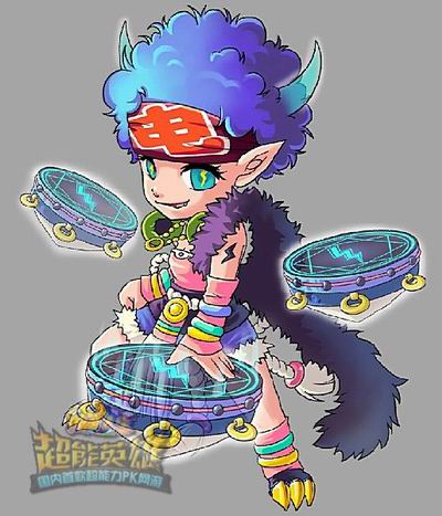 首先出场的,自然是存在感超强的摇滚辣妹“电仙”。一身糅合潮流元素与古朴风韵的打扮,充分显示出这位辣妹独特的审美观。抢眼的蓝色短卷发以及勾起挑衅弧线的嘴角给人留下野性不羁的印象,悬浮在空中的三个鼓使这位来自仙界的女鼓手更有魅力。据说在战场上每当电仙击鼓,狂雷就会从天而降,给予敌人致命一击,威力相当惊人。