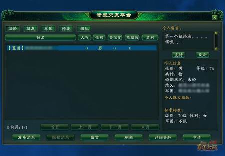 《赤壁》全新交友平台带来多种交友需求,玩家不仅可以寻友、寻找伴侣、甚至还可寻找军团、师徒关系以及组队关系等。只要你想,便可轻松在《赤壁》全新交友平台系统中寻得知己,只需提供玩家本身所在省份和城市、生日、职业、年龄、联系方式等,在不同的栏下发布信息,全服玩家即可看到你发布的消息,一旦有符合要求的玩家即会在该平台中响应。