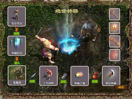 打破神器封印,即便普通玩家也有机会享有!击败BOSS后将获得的神器之魂附在自己的武器上,超酷的外形和高强的威力即刻拥有!