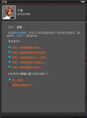 在大广场的西边的荣誉殿堂里站着排名专家——千里。他知道这个世界里每个运动员的成绩变化,他更清楚此时此刻的世界冠军究竟是谁。点击他和他交谈,你就能掌握所有排名信息。