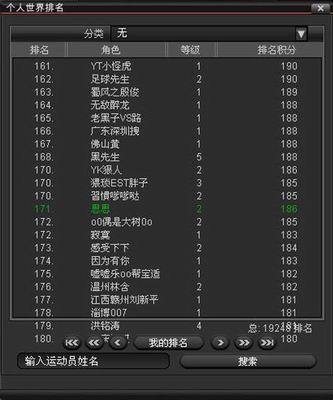 点击世界排名最右边的“+”号,就能看到详细的个人世界排名。这里很容易看到你和其他玩家的名次关系。点击“<<”和“>>”可以对排名进行翻页查看其他选手情况。如果你知道其他玩家的角色名,还可以通过输入名称来查看该玩家的排名情况哦!很简单吧~