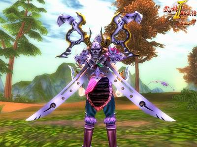 《武林群侠传2》这款背甲中的双刀从风格上看,不像是产自中原武林。两柄锃亮无比的刀交叉相叠,交叉处是一个恐怖的骷髅头。双刀的刀柄和刀身图案都充满了令人无法琢磨的神秘色彩,但作为背甲却有一股说不出的奇特之美。夺命双刀背甲的初始附加效果为:体力+3、气脉+3、潜力+3,非常适合以内功为主的玩家佩戴。