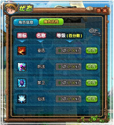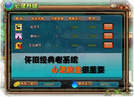 四大职业分别拥有三种不同的心法。这些心法一直到现在都是十分有用的,比如剑侍的轻灵术、豪杰的不灭金身等都是对职业本身属性的固定增长。又如阴阳士的火凤附体和仙术师的缓兵之计,前者提升自身攻击力,后者降低敌人的移动速度,就算是在PK中都是有着重要的利用价值。心法相比抗性更容易点满,每升一级都需要花费相应的三国币和活力,目前每一个心法满级为十级。早期抗性升级是十分麻烦的,需要狂点鼠标,因此玩家把这样的现象叫做“点抗”,后来直接拖动即可升级,可谓是人性化的体现。抗性分四项,每一项都有四十级,每个职业只需要升级其中三项就行。在早期,抗性的高低直接关系到你能在PK中存活多久,如果满抗,带来的效果是显而易见的。但由于抗性等级多,自然要消耗的一些三国币与活力,努力赚钱吧,朝满抗的目标前进。