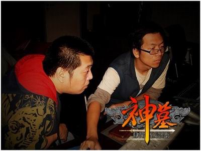 大家开始工作,他们今天的工作是给一款名为《神墓OL》游戏制作音效。图中胖子即为某大神李霖,他正在讲解录制过程的注意点。某人很激动的在偷拍中。