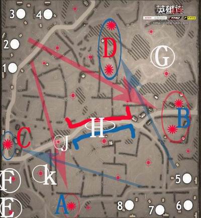 在这种作战形势下,如果联邦在对方没有防范时采用“上屋抽梯”之计,必定是另一番作战环境。一般情况下,实施过程中,联邦可以用8号位以一部兵力袭扰E点,给对方一些干扰,再以6、7号位全部兵力加上8号位部分兵力。抢下A、K点并设防,同时,以最快速度占领J点,并阻止敌增援兵力。以盟军顺利占领E、F点并在此两点上花费资源建立防线让其顺利“上屋”。