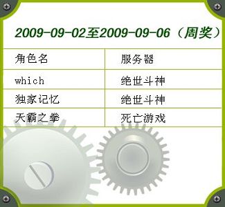 ● 第一周(2009年9月2日——2009年9月6日)周大奖获得者名单