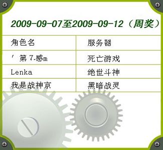 ● 第二周(2009年9月7日——2009年9月12日)周大奖获得者名单