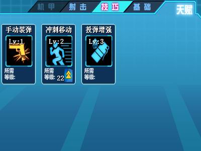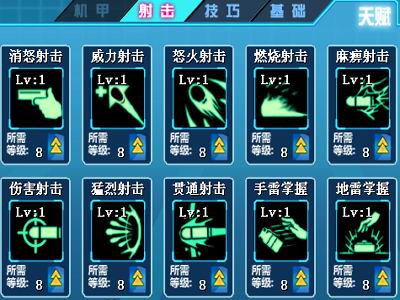 疯狂弹头的天赋属性,分为基础天赋、技巧天赋、射击天赋及尚未开放的机甲天赋四大类。每个人物将所有的天赋都学会,在一定的时间段内是不可能的。这也就需要给自己的角色定位。譬如基础天赋里,是升级体质锻炼,以增加血量,保证最大可能的存活率?还是升级怒气存储,得到更多机会施放怒气技能,主动出击,击倒敌人?又如技巧天赋中,选择升级冲刺移动,减少冲刺间隔,获得更多的机会冲出重围,在关键时候可冲散对方阵型?亦或升级手动装弹,加强机动性,边跑边打,游击作战?