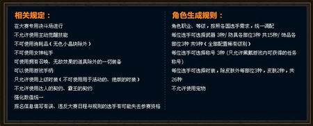 在比赛中,各个选手所使用的角色将由主办方按照各选手需求统一调配,每个选手所使用的武器、防具、称号(只可佩带任务内可以获得的称号)、时装都为三种(皮肤为两种),配置的级别都为稀有的级别(即紫装),比赛不得使用宠物,消耗品(无色小晶体除外)、达人契约、霸王契约以及主动觉醒和女神枪手。可使用手柄和除召唤、无敌道具以外的所有装备。强化数值统一,时装只可使用除活动和绝版时装之外的时装。所有选手在大赛专用决斗场进行比赛。以保证比赛的公平性和可观看性。