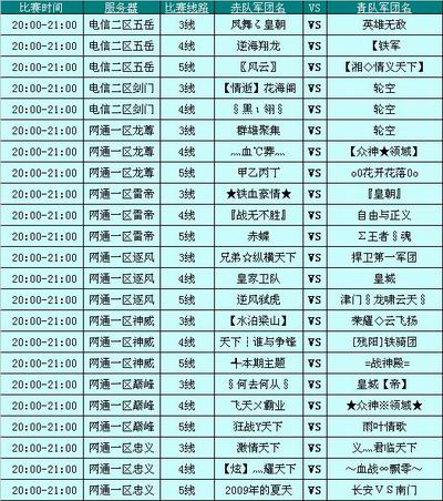 就在今晚20:00-21:00,电信二区五岳、剑门,网通一区龙尊、雷帝、逐风、神威、巅峰、忠义,他们将进行激烈的服务器选拔赛三强席位最后的争夺,到底谁将最后成为服务器三强,让我们拭目以待。