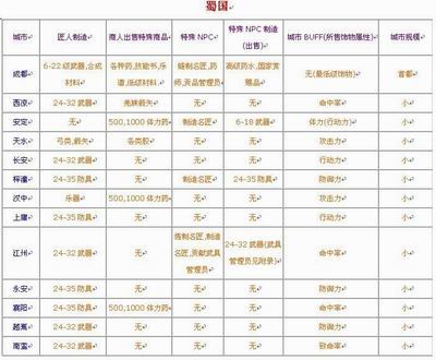 蜀国在城市的规模上一般都是小城市,与魏国新野等中型城市比起来缺少特殊材料的现货,比如新业玩家可以直接买到34-39级武器现货。但是蜀国各种物资和城市BUFF相对平均。并且与邻国接壤土地较少,蜀国玩家可以倾全国之力扼守要口,只要要口不失汉中无忧矣。再加之关羽、诸葛亮、赵云等人的影响各个服务器中蜀国人口一直名列前茅!