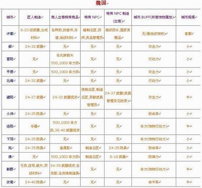 魏国占据了三国时期中国北方地区,由于北方民族多以豪爽、粗狂著称于世,魏国城市的BUFF也多以攻击力、致命力为主。力士这个职业在魏国可谓是如鱼得水,基本打到哪个城其BUFF都有很大的作用。并且魏国初始就有四个中型城市,列三国之首,比之其他二国在发展上就占据了先天优势。再加之有34-39级武器、防具现货的供应,前期国战中魏国往往能够占据大半江山。这也让不少大中型公会纷纷加入魏国,试图独占天下。