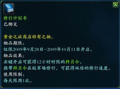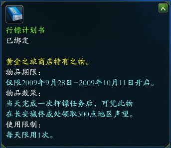 拥有了“月出之章”便可进入黄金之旅商店选购一番了,这里陈列各种计划书,有“行镖计划书”、“垂钓计划书”、“从军计划书”、“名望计划书”、“牧羊计划书”以及“修行计划书”等。在活动时间内进入商店即可按照心意尽情选择,不同计划书可为玩家带来不同的奖励,其中包括:地区声望、灵气值、文武功勋、名望、历练值以及12小时双倍历练的拜月令等至宝。轻轻松松帮帮忙,即可获得如此众多的至宝,只要你有足够的“月出之章”,整个商店的东西都可以尽情换得。