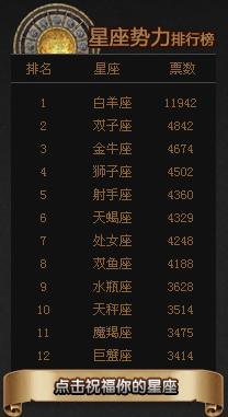 广大星座玩家已经纷纷响应官网签到活动,你能看着自己的星座被其他星座超越吗?到官网签到,壮大自己的星座势力,一举摘得神秘星座大奖!