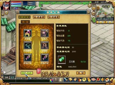 据相关人士介绍,伴随着兑换系统上线,新版本将推出多套全新武侠套装。比如30级的绝情套装,40级的灭罪套装,70级的狮王套装等。每一种套装将分为衣服和饰品两类,有帽子、护腕、项链、戒指等共十个部位的装备,能极大的满足玩家的收藏爱好。更令玩家欣喜的是,普通的套装可以通过相应的任务,转换成属性极品的金色套装,不仅威力大增,而且有特殊的光学效果。穿上它们,将助你金光闪闪走江湖。
