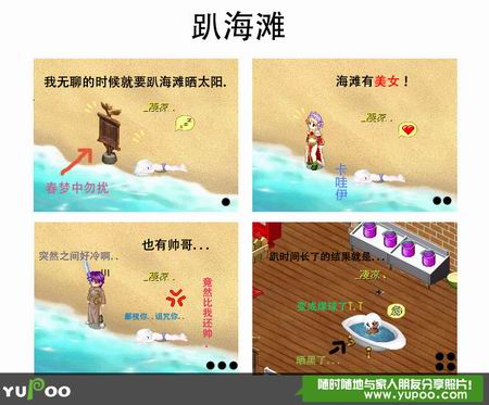 《飘流5.0》的新手海滩是块热闹的地方,它不仅是玩家摆摊买卖的集市,还是大家渡假游玩的好去处。图中一型男就爱好晒太阳,他整天爬在海滩一动不动,美女来了就偷瞄一眼,帅哥来了就狠狠诅咒,结果一个黄金假期过去,整个人都晒成了煤球一样。